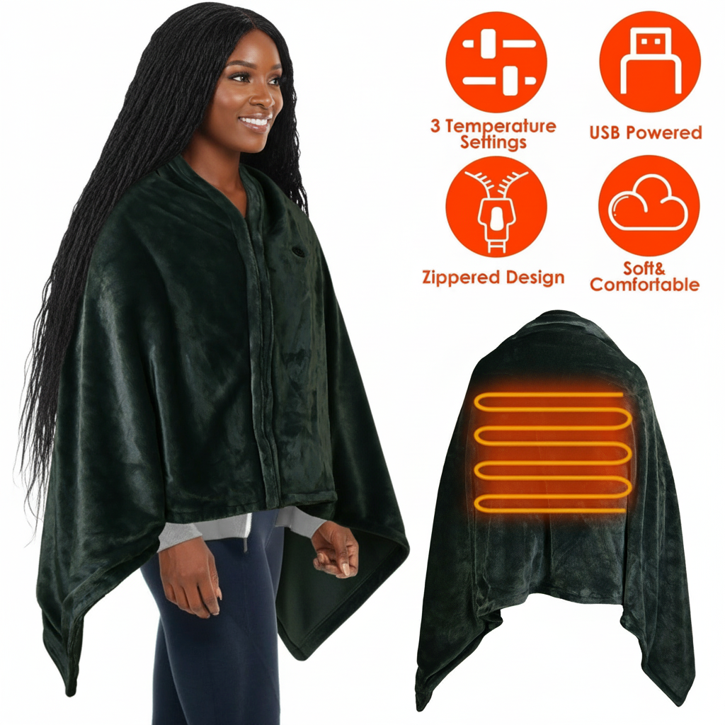 Heated Blanket Shawl – 3-Setting Electric Wrap for Home, Office & Travel | Zippered, Washable & Soft Flannel